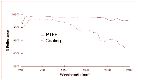 聚四氟乙烯涂料在0.2-2.5微米波長(zhǎng)范圍內(nèi),光譜反射率高于氧化鎂和硫酸鋇。另外,該涂料不怕潮濕,暴露在紫外光下也不會(huì)變黃。缺點(diǎn)也有很多:易碎、對(duì)溫度敏感、熱穩(wěn)定性差、容易污染、價(jià)格高。下圖是聚四氟乙烯涂料與硫酸鋇涂料的反射率對(duì)比圖。