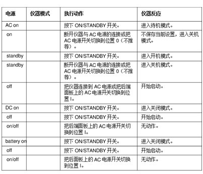 取決于使用的電源,前端面板上ON/STANDBY開關(guān)會導(dǎo)致不同的儀器模式。如下表: