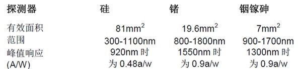 例如美國藍菲光學公司(Labsphere)的一款激光功率計(LFPMS)采用了硅型二極管探測器。 它的波長響應范圍在300-1100nm處,其中峰值響應在920nm時到達0.48A/W。下圖2是LFMPS光電二極管探測器的性能參數(shù)。