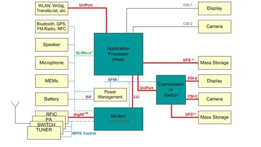 MIPI聯(lián)盟下面有不同的工作組,分別定義了一系列的手機內(nèi)部接口標準,比如攝像頭接口CSI、顯示接口DSI、射頻接口DigRF、麥克風 /喇叭接口SLIMbus等。統(tǒng)一接口標準的好處是手機廠商根據(jù)需要可以從市面上靈活選擇不同的芯片和模組,更改設計和功能時更加快捷方便。下圖是按照 MIPI的規(guī)劃下一代智能手機的內(nèi)部架構(gòu)。