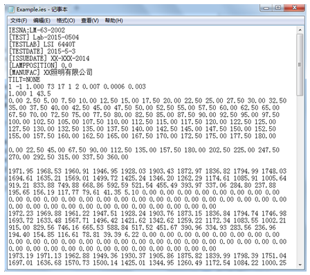 下面我們以GSC實驗室利用美國LSI 6440T分布光度計測試的Example.ies文件為例,逐條詳細講解,揭開其神秘面紗。