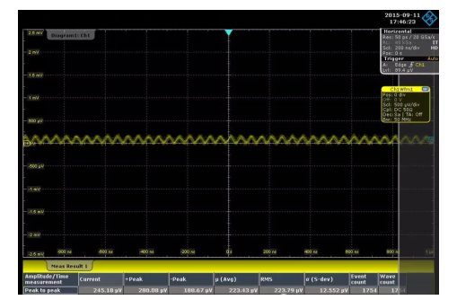 下圖展示了利用RTO示波器對20MHz 50uV RMS正弦信號的實時測試結(jié)果,可以看到RTO示波器對這樣小的信號仍可進行穩(wěn)定觸發(fā)和準確測量。