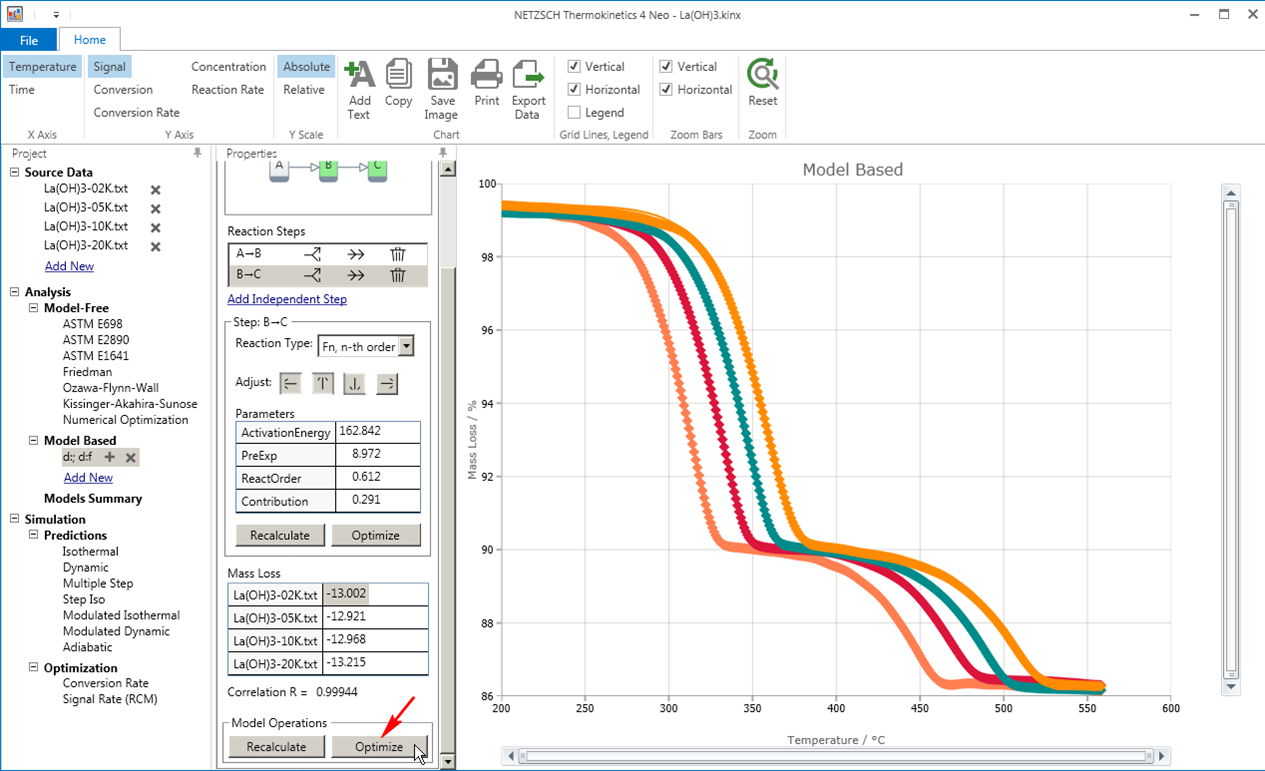 NETZSCHKineticsNeo是耐馳公司繼經(jīng)典的ThermoKinetics3.1之后,重新設(shè)計(jì)方案、全新推出的新的動力學(xué)軟件。軟件著重分析反應(yīng)速率與溫度的相關(guān)性,故又稱為熱動力學(xué)(Thermokinetics)。分析最終可給出動力學(xué)模型(或可在不同的溫度條件下正確描述實(shí)驗(yàn)數(shù)據(jù)的方法)。基于動力學(xué)模型,可在用戶定義的溫度條件下,對反應(yīng)體系的行為進(jìn)行預(yù)測,或應(yīng)用于工藝條件的優(yōu)化。