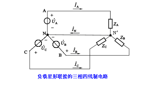 三相電源不對稱負載ZA,ZB,ZC不相等示例:由單相負載組成的三相電源負載。