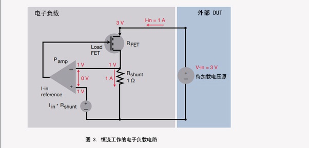 電流放大器將分流器上的壓降與參考編程值進行比較(例如1A*1Ω=1V)。放大器輸出信號調節(jié)FET電阻和電子負載的輸入電流。這類反饋配置允許負載動態(tài)地改變電阻并保持編程電流,而不受電源設備電壓變化的影響。負載可以吸收所需電流的最小電壓受輸入電流水平和FET的低電壓行為特性的限制。
