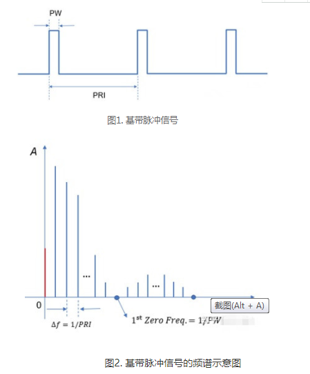 這就需要了解基帶脈沖信號的頻譜了,假設(shè)圖1所示基帶脈沖的脈寬為PW,周期為PRI,則相鄰譜線間距為1/PRI。為方便起見,圖2所示的頻譜示意圖只包含了主瓣和一旁瓣,理論上講,脈沖的頻譜包含無數(shù)多個旁瓣,只是越遠離主瓣,旁瓣的幅度越小。
