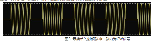 2.射頻脈沖的測試:與基帶脈沖不同,射頻調(diào)制脈沖是指在脈內(nèi)引入了載波,圖3給出了最簡單的射頻脈沖。從本質(zhì)上講,這種射頻脈沖生成的過程就是基帶脈沖對載波調(diào)幅的過程,因此射頻脈沖的頻譜與基帶脈沖頻譜基本相同,只是前者將頻率搬移至載波[公式]處,如圖4所示。