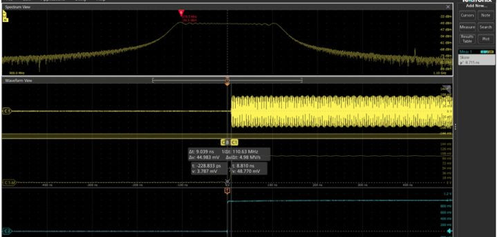 以應用較多的線性調(diào)頻脈沖(chirppulse)為例,其頻譜不再服從Sa(f)分布,而是類似于帶通濾波器的幅頻響應,并沒有較高幅度的旁瓣,如圖5所示,這是使用泰克示波器MSO64的SpectrumView頻譜分析模式實測的chirppulse波形和頻譜。Chirppulse信號具有一定的調(diào)制帶寬BW,測試這類信號時,推薦的示波器帶寬不能小于:fc+BW/2。