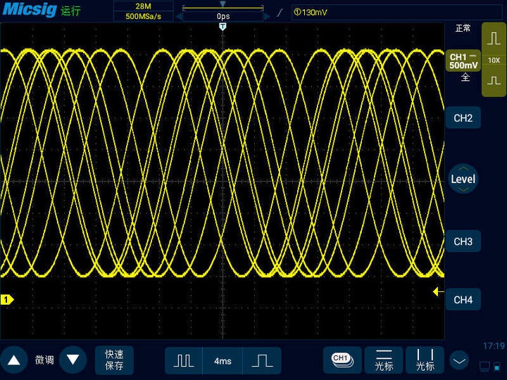 數(shù)字示波器的時基是4ms,代表屏幕橫坐標上波形走過一格是4ms的時間,數(shù)字示波器橫坐標一共有14格,那么一屏幕就是56ms的波形。