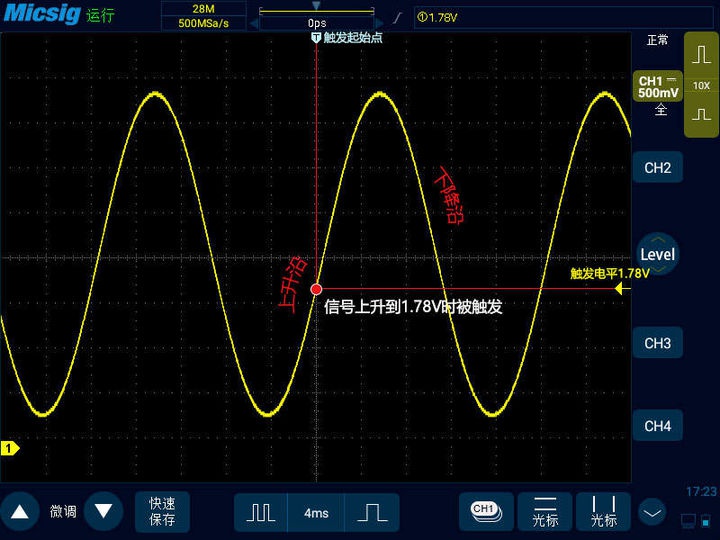 想要波形每次都一樣,那么就是要找到波形重復的規(guī)律,我們繼續(xù)觀察這個正弦波,這是一個周期性變化的正弦波,它的每個周期都有一個上升沿和下降沿,如果我們讓數(shù)字示波器每次都從上升沿開始捕捉那就可以重復了嗎?