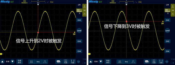上述所說這種尋找重復波形的思路是數(shù)字示波器中最常見的也是最常用的觸發(fā)思路,叫做邊沿觸發(fā)。通過調節(jié)上升邊沿或者下降邊沿,來定義數(shù)字示波器觸發(fā)起始點捕獲的是上升中的波形還是下降中的波形。