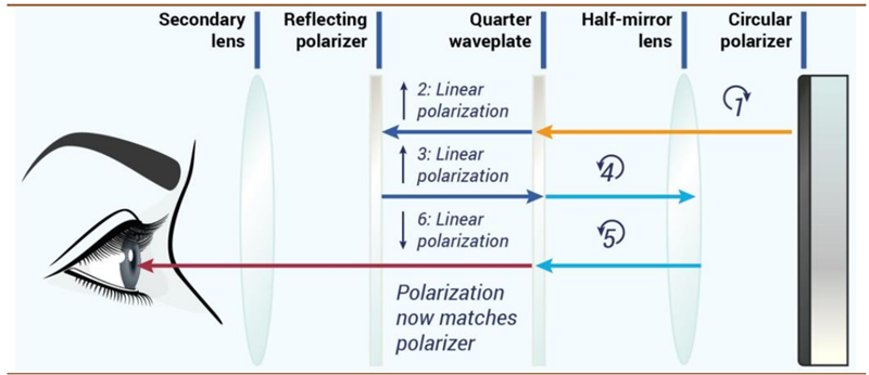 以下圖為例,圓偏振光在通過 1/4 相位延時片后變?yōu)榫€偏振光到達(dá)反射偏光片并被反射,接著第二次通過 1/4 相位延時片變回圓偏振光被半透半反鏡反射并第三次通過 1/4 相位延時片,再次變?yōu)榫€偏振光,因為本次相比第一次光線旋轉(zhuǎn) 90°,得以通過反射偏光片完成成像。
