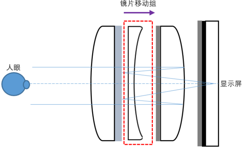Pancake 方案為組合透鏡,通常可通過控制其中一片透鏡位置進(jìn)行屈光度調(diào)節(jié)。對于近視用戶而言,過往佩戴 VR 頭顯進(jìn)行屈光調(diào)節(jié)更多采用的是更換鏡片的方式,試戴過程麻煩且調(diào)檔選擇較為有限。而當(dāng)光學(xué)方案升級到 Pancake 技術(shù)時,屈光度調(diào)節(jié)方式有了更多更便利的選擇。因為 Pancake 方案一般為多組透鏡的組合,可以通過移動其中一組鏡片調(diào)整整個光學(xué)模組的折射率,從而滿足調(diào)焦需求,這種方式對于傳統(tǒng)單片非球面透鏡和菲涅爾透鏡方案就無法實現(xiàn)。當(dāng)然,VR 頭顯也可通過移動屏幕來調(diào)整屈光度,但是外調(diào)焦方式會改變整個模組總長,頭顯設(shè)計時需要預(yù)留體積空間,輕薄性較差。