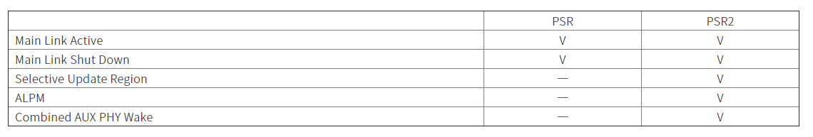 PSR與PSR2最大的差異為面板畫面全部刷新與部份刷新,更進階的PSR2技術可只刷新局部畫面(Selective Update),由信號端發(fā)送需要刷新的位置通知接收端做對應區(qū)域刷新,代表繪圖處理器僅須傳送少部分需要被刷新的數(shù)據(jù),再加上PSR2同時可支持進階連接電源管理ALPM(Advanced Link Power Management)控制要求接收端能迅速離開待機與睡眠狀態(tài)。