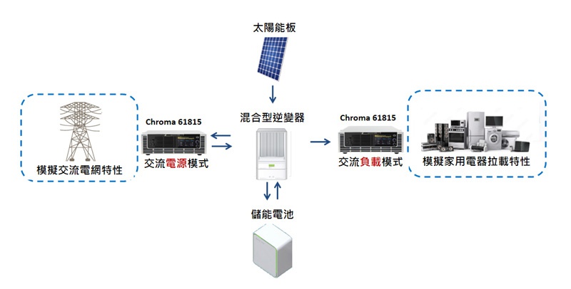 ▲Chroma 61815一機(jī)實現(xiàn)混合型逆變器的交流電源和交流負(fù)載測試需求