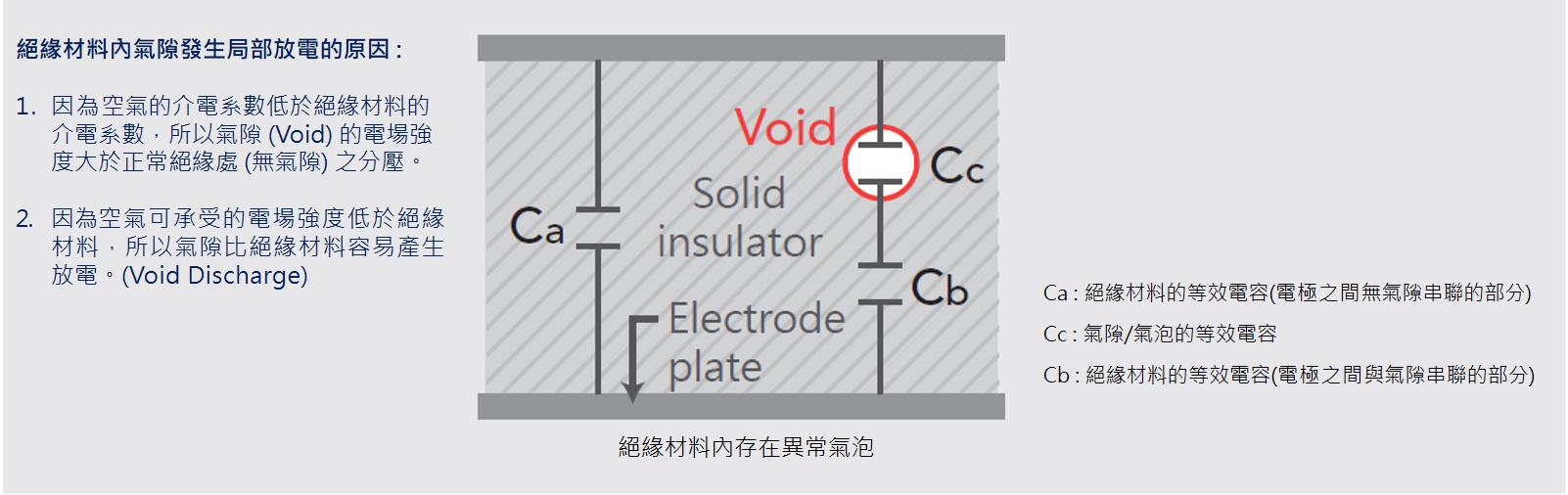 當(dāng)電壓施加在含有兩個(gè)以上絕緣材料的絕緣物體時(shí),有一個(gè)絕緣材料發(fā)生放電且至少仍有一個(gè)絕緣材料維持正常的絕緣狀態(tài),此放電現(xiàn)象稱之為局部放電。舉例來(lái)說(shuō),當(dāng)待測(cè)物的絕緣材料中存在異常氣隙,因?yàn)榭諝獾慕殡娤禂?shù)比絕緣材料低以及空氣的崩潰電壓比絕緣材料低,所以異常氣隙處會(huì)分到相對(duì)高比例的電壓且容易發(fā)生局部放電。