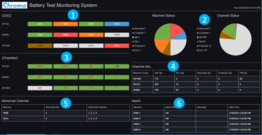 實驗室的電池測試系統(tǒng)會隨時回報各通道測試的狀態(tài),透過17091 BTMS進(jìn)行匯總并呈現(xiàn)在即時監(jiān)控看板。 因此管理人員可以清楚的看到每個充放電系統(tǒng)與溫箱的使用現(xiàn)況、掌握設(shè)備與通道的使用狀態(tài)統(tǒng)計,當(dāng)設(shè)備發(fā)生異常,看板可以迅速提示警示訊息,并發(fā)出聲音警示。