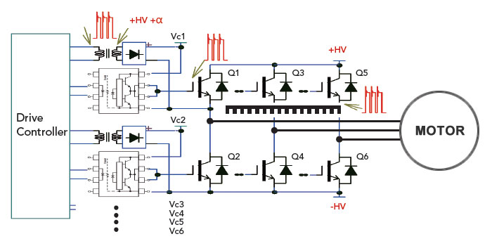 另外,每個(gè)模塊的閘極(Gate)與射極(Emitter)或源極(Source)之間?作偏壓可能是由各別的變壓器所提供,而變壓器的??次側(cè)之間也會(huì)存在?頻的?電壓差?當(dāng)變壓器一二次側(cè)的絕緣能?不足,持續(xù)性異常放電的突波也可能會(huì)使數(shù)字控制動(dòng)作異常及導(dǎo)致晶體管故障?