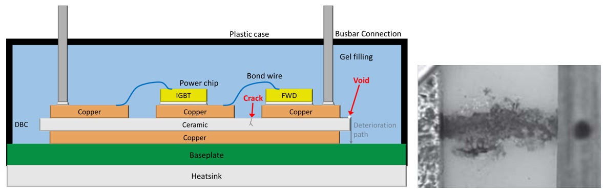 功率組件中的IGBT與SiC-MOSFET被應(yīng)用于各種領(lǐng)域(譬如:電子產(chǎn)品、工業(yè)設(shè)備、航空航天、軍用設(shè)備、鐵路設(shè)備、新能源、智慧電網(wǎng)、新能源車(chē)等),且經(jīng)常被使用于高功率/大電流的電源轉(zhuǎn)換/控制線路,工作電壓通常都是數(shù)千伏特,由于會(huì)被切換ON/OFF狀態(tài)的關(guān)系,模塊中的閘極(Gate)與集極(Collector)或汲極(Drain)之間,以及模塊與散熱板之間會(huì)出現(xiàn)PWM的高電壓差。當(dāng)高電壓跨越在含有氣泡、氣隙或裂縫的絕緣材料時(shí),就有較大的可能性會(huì)發(fā)生局部放電,經(jīng)過(guò)長(zhǎng)時(shí)間的工作后會(huì)慢慢使絕緣材料逐漸劣化,進(jìn)而造成絕緣材料的絕緣失效導(dǎo)致產(chǎn)品損壞。另外,每個(gè)模塊的閘極(Gate)與射極(Emitter)或源極(Source)之間工作偏壓可能是由各別的變壓器所提供,而變壓器的一二次側(cè)之間也會(huì)存在高頻的高電壓差。當(dāng)變壓器一二次側(cè)的絕緣能力不足,持續(xù)性異常放電的突波也可能會(huì)使數(shù)字控制動(dòng)作異常及導(dǎo)致晶體管故障。
