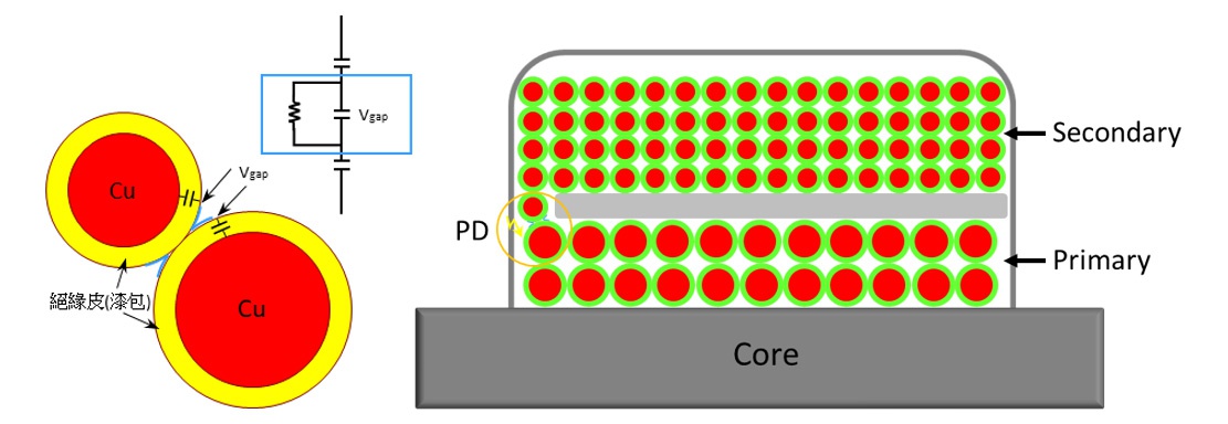 當(dāng)絕緣體內(nèi)存在氣泡(Void)或絕緣體間存在氣隙(Air gap)時(shí),在正常工作電壓下氣泡或氣隙容易發(fā)生局部放電(Partial Discharge,PD),導(dǎo)致絕緣劣化造成絕緣質(zhì)量異常,例如:樹(shù)酯內(nèi)有氣泡或漆包線間的氣隙,因?yàn)榭諝獾慕殡娤禂?shù)較低,氣泡或氣隙的電容量比原絕緣材料低,所以會(huì)分到相對(duì)高比例的電壓,且在相同間隙距離條件下,氣泡或氣隙的崩潰電壓比絕緣材料的低。此類(lèi)放電發(fā)生于氣泡或氣隙等局部瑕疵, 但與其串行之絕緣材仍維持正常的放電現(xiàn)象稱(chēng)之為局部放電。