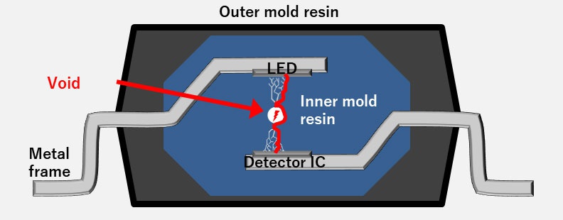 光耦合器與數(shù)字隔離器被應(yīng)用于各種需要隔離的環(huán)境,當(dāng)隔離的高電壓跨越在含有氣泡或裂縫的絕緣材料時(shí),就可能會(huì)有足夠高的分壓在氣泡或裂縫上導(dǎo)致發(fā)生局部放電。 經(jīng)過(guò)長(zhǎng)時(shí)間的劣化后,因絕緣材料的絕緣失效而導(dǎo)致電壓的隔離失效(如圖五)。