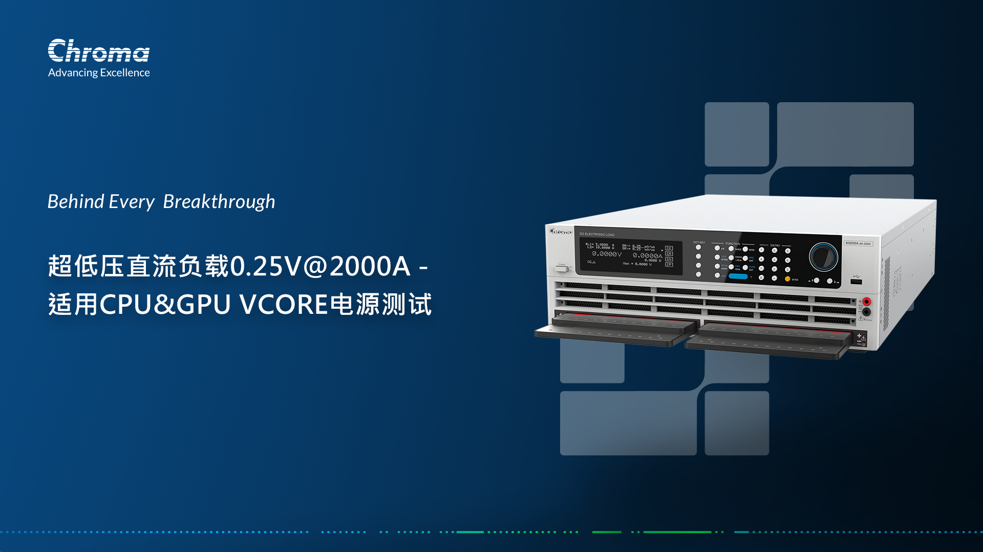 Chroma全新超低電壓直流電子負(fù)載以其卓越性能與創(chuàng)新設(shè)計(jì),無論是0.25V的最低工作電壓,還是高達(dá)2,000A的最大額定電流,前銅排設(shè)計(jì)改善了連接不便及降低感量,都將確保在VCORE電源測(cè)試結(jié)果的準(zhǔn)確性和可靠性。