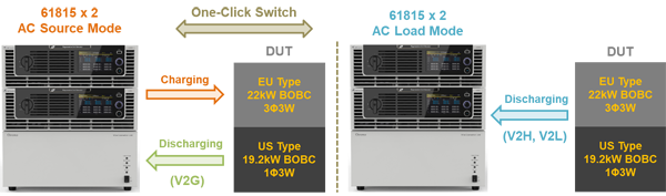 Chroma 61815作為3U/15kVA的高功率密度電網(wǎng)仿真電源,不僅能作為交流源來模擬市電,亦可透過交流負載選配功能,來仿真家用設備或其他交流負載特性。透過兩臺61815單機并聯(lián)搭配專用的接線整合治具,能以10U高的精簡設備體積和單純的三相四線輸出設計,輕松實現(xiàn)歐洲22kW三相、及美國19.2kW的單相三線的交流測試方案。且針對V2G、V2H、V2L等測試情境條件,Chroma 61815可一鍵切換交流源和交流載模式,仿真不同電網(wǎng)環(huán)境(如頻率、電壓變化)及不同負載條件,來對應BOBC各項交流測試需求。