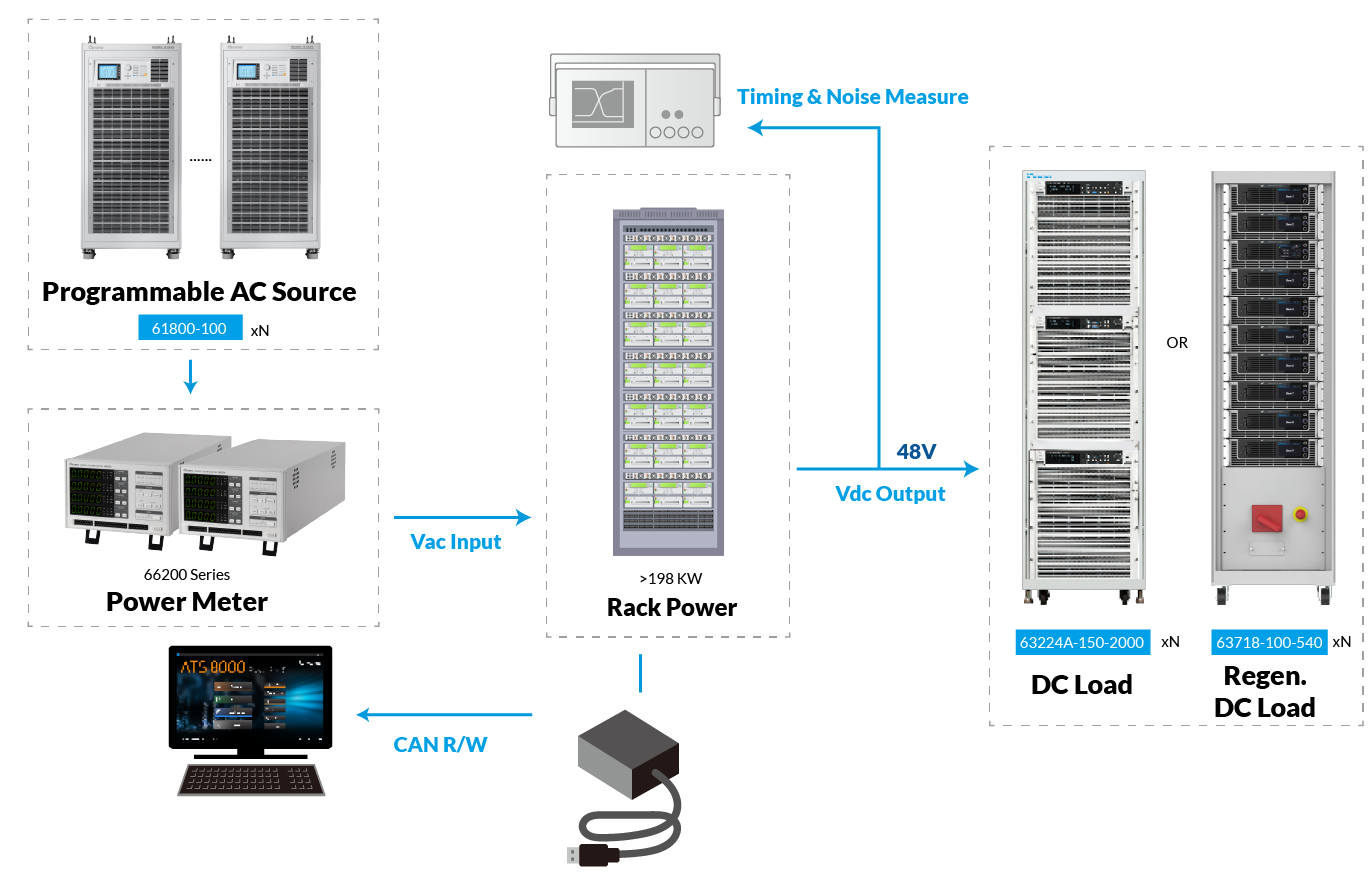 數(shù)據(jù)中心的服務器電源系統(tǒng)結(jié)構(gòu)日趨復雜,包括電源供應單元(PSU)、備援電池單元(BBU)、電源架(Power Shelf)以及機架電源(Rack Power)等裝置,這些設備必須同時滿足高效能、熱插入能力及PMBUS通訊兼容性的要求。致茂電子以其豐富的電源測試經(jīng)驗,推出以Chroma 8000為基礎的客制化測試系統(tǒng),專為服務器電源產(chǎn)品設計,包含多項特色與優(yōu)勢: