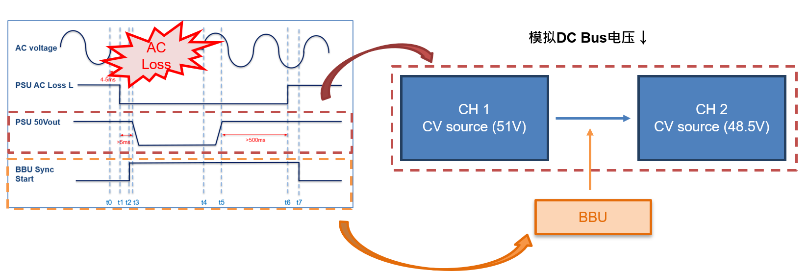 在環(huán)境模擬應(yīng)用中,憑借內(nèi)建的恒壓模式(CV Mode),系統(tǒng)可精準(zhǔn)重現(xiàn)服務(wù)器機(jī)柜內(nèi)DC Bus電壓動(dòng)態(tài)變化。用戶可透過(guò)通道設(shè)定:一通道維持 51V恒壓電流源,另一通道仿真48.5V恒壓負(fù)載端,完整再現(xiàn)機(jī)柜斷電時(shí)的運(yùn)行模式。當(dāng) AC 端斷電導(dǎo)致直流母線電壓由51V下滑至48.5V臨界值時(shí),系統(tǒng)將自動(dòng)觸發(fā) BBU介入,并全程監(jiān)控其響應(yīng)速度與放電效能。此一完整解決方案,能真實(shí)還原數(shù)據(jù)中心應(yīng)用場(chǎng)景,協(xié)助使用者提前驗(yàn)證BBU的效能與可靠性。