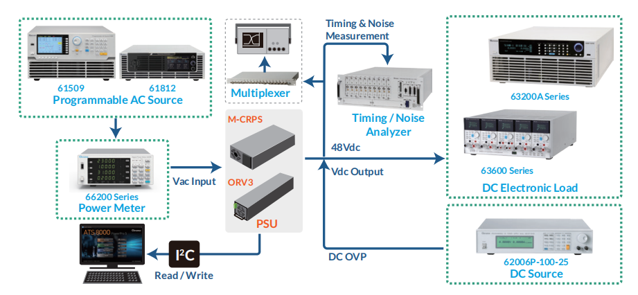 服務(wù)器的穩(wěn)定運行仰賴高效能與高可靠度的電源供應(yīng)器(PSU)。其核心功能是將來自電網(wǎng)的交流電(AC)轉(zhuǎn)換為服務(wù)器運作所需的24V/48V直流電(DC)。依據(jù)M-CRPS、OCP ORV3測試指南,Chroma直流電子負(fù)載63200A系列可滿足測試PSU規(guī)格與性能的要求。尤其針對測試PSU的瞬間功率及動態(tài)電流,電子負(fù)載63200A的高速動態(tài)特性更是適合。Chroma針對服務(wù)器電源PSU提供完整的測試方案,透過自動化測試流程與編程測試項目,驗證PSU在實際應(yīng)用中的性能與可靠度,確保其滿足高標(biāo)準(zhǔn)的運行需求。相關(guān)測試設(shè)備與系統(tǒng)架構(gòu)建議如下:
