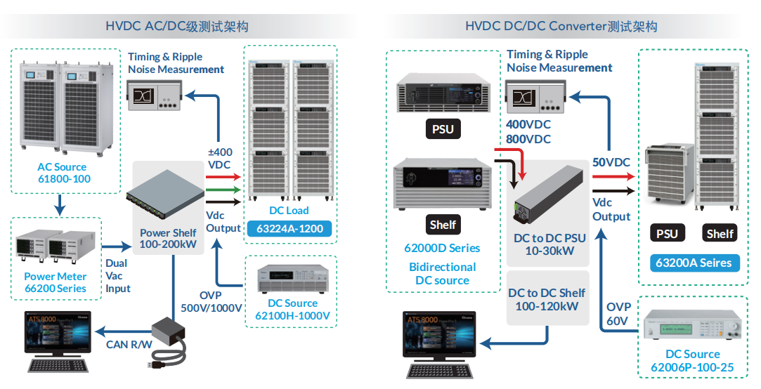 隨著AI運(yùn)算大功率需求,也有服務(wù)器系統(tǒng)采用HVDC電源構(gòu)架。前級(jí)為AC電源轉(zhuǎn)換±400Vdc或800Vdc的PSU及power shelf,后級(jí)±400Vdc輸入的DC/DC電源轉(zhuǎn)換成50Vdc的PSU及power shelf供電給服務(wù)器系統(tǒng)。Chroma具備完整系列的測(cè)量?jī)x器,可符合產(chǎn)品規(guī)格與測(cè)試需求。尤其63200A直流電子負(fù)載,高電壓1200V機(jī)種仍有足夠電流拉載能力,來(lái)適用于50V輸出的電源測(cè)試。另外62450D-2000HL雙向直流電源,具有能源回收的負(fù)載功能,其雙檔位的設(shè)計(jì),非常同時(shí)適用于400V或800V的測(cè)試應(yīng)用。