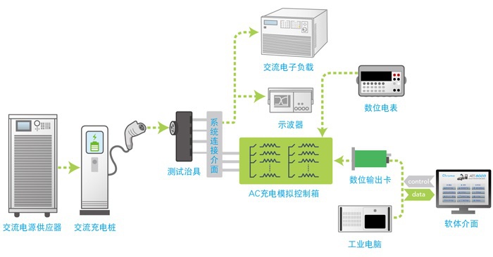 電動汽車充電樁測試系統(tǒng)是以Chroma8000-ATS為基礎(chǔ)的客制化系統(tǒng),專門針對交流充電樁與直流充電機(EVSE)進行驗證,并配備了優(yōu)化的標(biāo)準(zhǔn)測試項目,可符合法規(guī)SAE-J1772,CNS15511,中國能源局標(biāo)準(zhǔn)NB/T 33001,NB/T33002,NB/T33008.1與NB/T33008.2;中國國家標(biāo)準(zhǔn)GB/T 18487.1,GB/T 27930,電動汽車傳導(dǎo)充電互通性測試規(guī)范*…等要求對產(chǎn)品進行測試,所以此系統(tǒng)不但提供了電氣特性測試,也進行通信協(xié)議測試,可以模擬實際充電樁在操作時,同時輸出功率與通信,可測試充電樁是否會在大功率傳輸過程中所產(chǎn)生的磁場而干擾到通信。并可模擬各信號線在充電過程中 Open/Short/CC1信號電壓變化時充電樁相應(yīng)的保護動作及回應(yīng)間已排查通訊隱患。