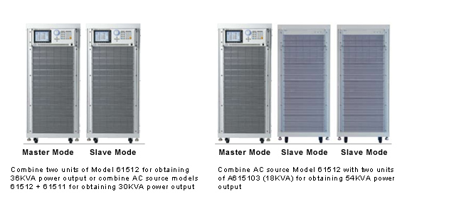 61511/61512/61611/61612交流供應(yīng)器可經(jīng)由(Master-Slave)并聯(lián)輸出模式以達(dá)成使用者對(duì)于高功率的需求。例如:連接5臺(tái)18KVA交流供應(yīng)器在并聯(lián)模式下可實(shí)現(xiàn)90KVA的輸出功率。使用者還可利用專為并聯(lián)模式所開發(fā)的18KVA并聯(lián)專用機(jī)為有效替代slave單機(jī)的解決方案。請(qǐng)參考以下為61511/61512/61611/61612及A615103在并聯(lián)模式下的配置圖。