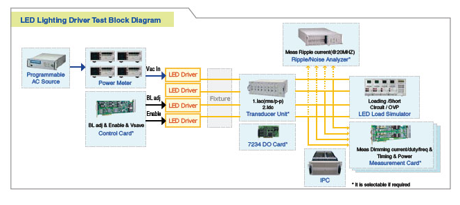 此系統(tǒng)搭配的PCI介面的功能卡– LED電源量測(cè)卡與控制卡,其主要功能在量測(cè)調(diào)光電流/頻率/周期占空比與提供調(diào)光控制訊號(hào)(直流電壓, 脈波寬度調(diào)變, SM BUS) 與致能開(kāi)關(guān)訊號(hào)。另外,也可利用時(shí)序/雜訊量測(cè)卡來(lái)作為20MHz 頻寬下的漣波電流量測(cè)。