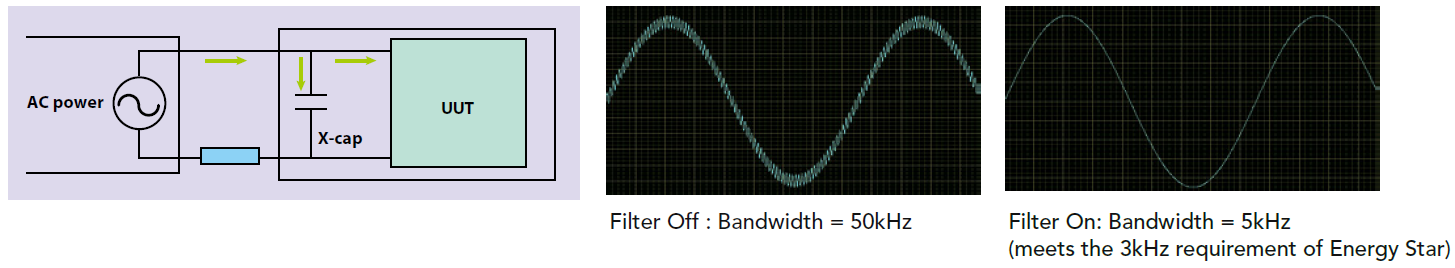 66203/66204數(shù)位功率表的量測帶寬大于50kHz。但是在有些應(yīng)用上,并不想把高頻成份包括至量測值中。例如量待測物的輸入電流時,尤其是小功率應(yīng)用狀況下,一些因為輸入電源的開關(guān)切換產(chǎn)生的高頻電流會導(dǎo)至電流值增加,所以不希望被量測入總數(shù)值中。66203/66204數(shù)字功率表可啟動5kHz的低通濾波器(Low Pass Filter),以濾除掉不想要的高頻成份。這種彈性的設(shè)計,可讓使用者針對不同量測需求,來得到適當(dāng)?shù)牧繙y數(shù)值。