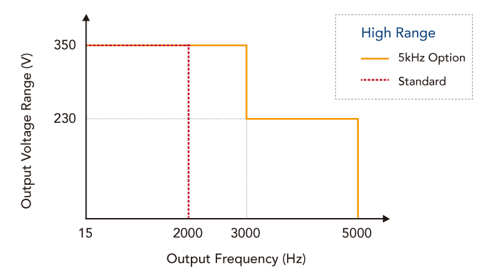 Chroma 61507/61508/61509可藉由選購(gòu)配件提供5kHz高頻率輸出功能。而搭載此選購(gòu)配件后,交流源機(jī)臺(tái)會(huì)有不同的High / Low檔位輸出電壓范圍,其細(xì)節(jié)如下圖所示。
