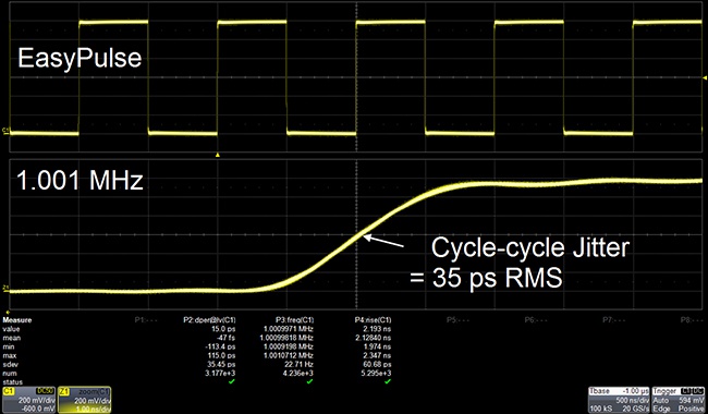 DDS方法輸出方波/脈沖時(shí), 如果采樣率和輸出頻率不成整數(shù)倍關(guān)系,將產(chǎn)生一個(gè)采樣周期的抖動(dòng)。采用EasyPulse技術(shù)可克服這個(gè)缺陷;產(chǎn)生低抖動(dòng)的方波和脈沖信號(hào),此外還具有以下優(yōu)勢(shì):