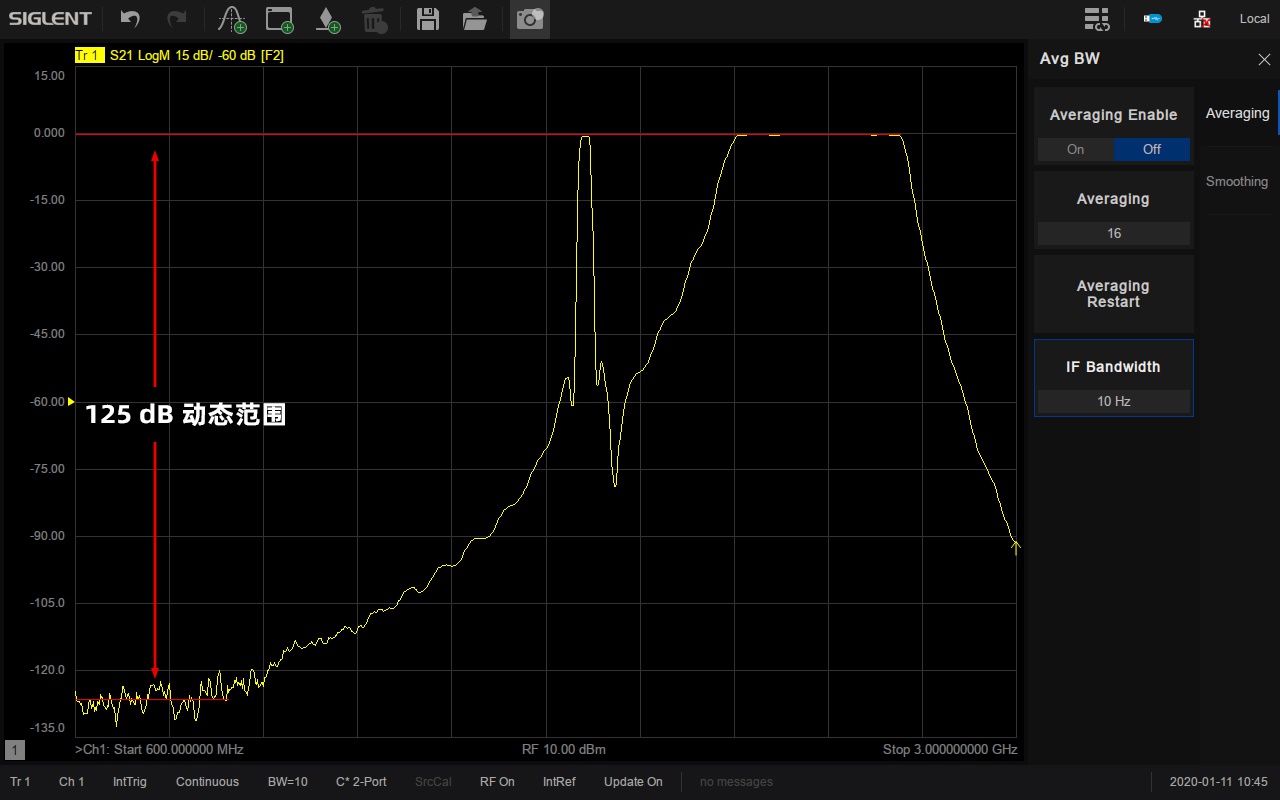 系統(tǒng)動態(tài)范圍是VNA一個非常重要的指標(biāo),它是VNA源的最大輸出功率與測試端口本底噪聲的差值。SNA5000X的動態(tài)范圍可達125 dB@10Hz IFBW,接收機噪底-125 dBm/Hz,可適用于對動態(tài)范圍要求比較高的測試場景,比如同時測量濾波器的通帶和帶外抑制性能。