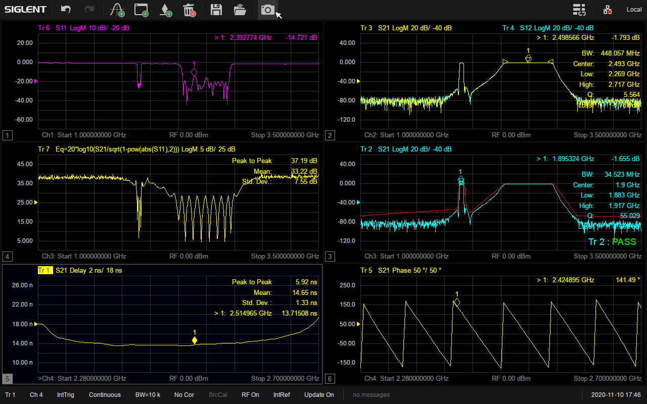 SNA5000X系列支持在多個窗口添加多條跡線進行全4端口S參數(shù)測試,并且具備多種顯示格式,比如 Log Mag,Lin Mag,Phase,Delay,Smith,SWR,Polar等,可以方便快捷地分析被測物的傳輸系數(shù),反射系數(shù),駐波比,阻抗匹配,相位,延時等參數(shù)。在生產(chǎn)線驗證天線,濾波器等的特性時,還可以保存參考跡線或者添加Limit模板進行通過失敗測試,有利于提高生產(chǎn)效率。