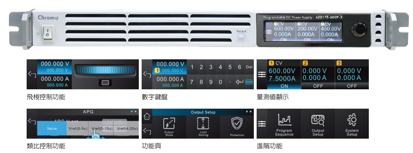 Chroma 62000E系列可程控直流電源供應器提供1U機框內含單通道1.7kW、3.4kW、5kW及三信道1.7kW,為采用高功率密度之電源設計,具有固定范圍(Fixed-range Output)電源及寬范圍(Auto-range Output)電源兩款共28個不同的機型,輸出電流范圍可達22.5A,電壓范圍至1200V。