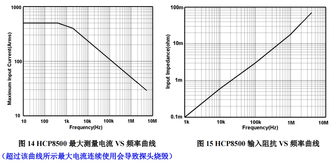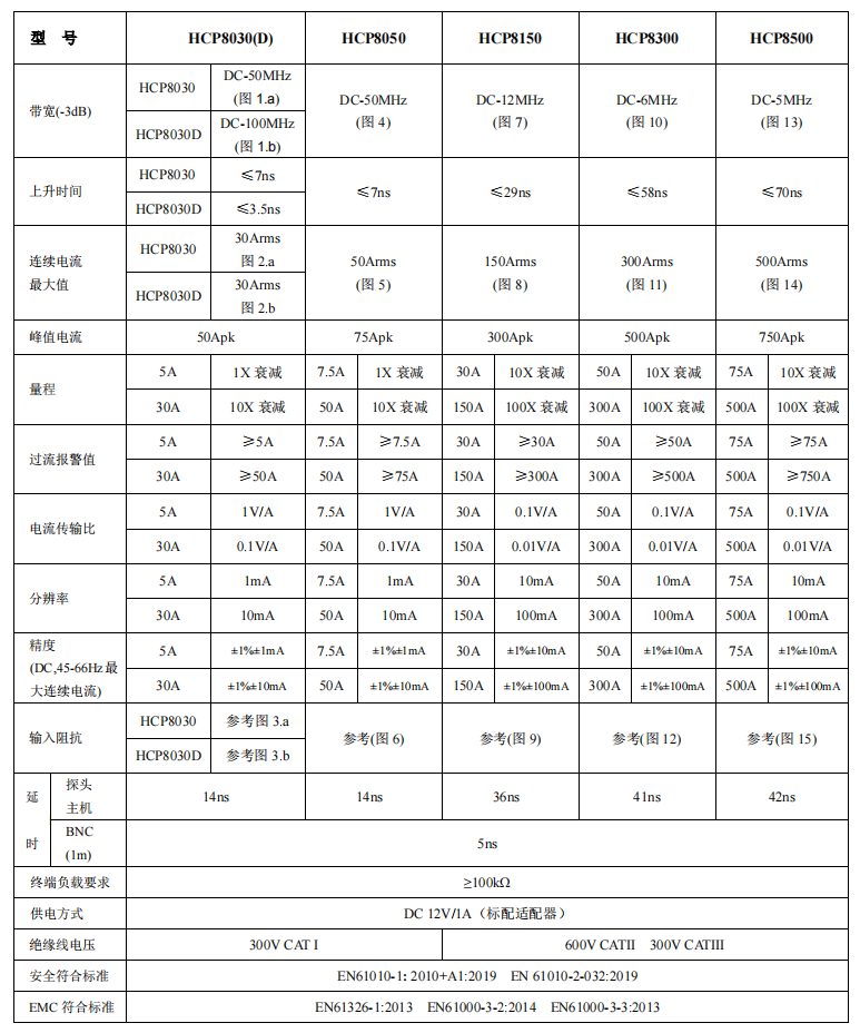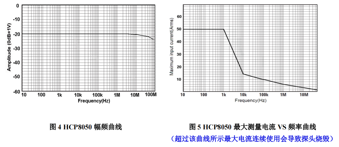 HCP8500 分為 500A 和 75A 兩個(gè)量程:500A 量程,探頭電流傳輸比 0.01V/A;75A 量程,探頭電流傳輸比 0.1V/A。
