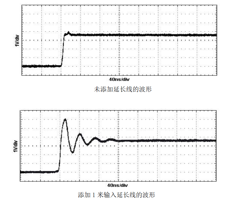 2)在測量時應(yīng)盡量不要延長輸入線,否則會引入更多的噪聲。如果必須要額外加長輸入線,則應(yīng)保證延長線的長度相同,而且輸入頻率不超過 5MHz,如果超過 5MHz 輸出會有一定的誤差。如下圖所示: