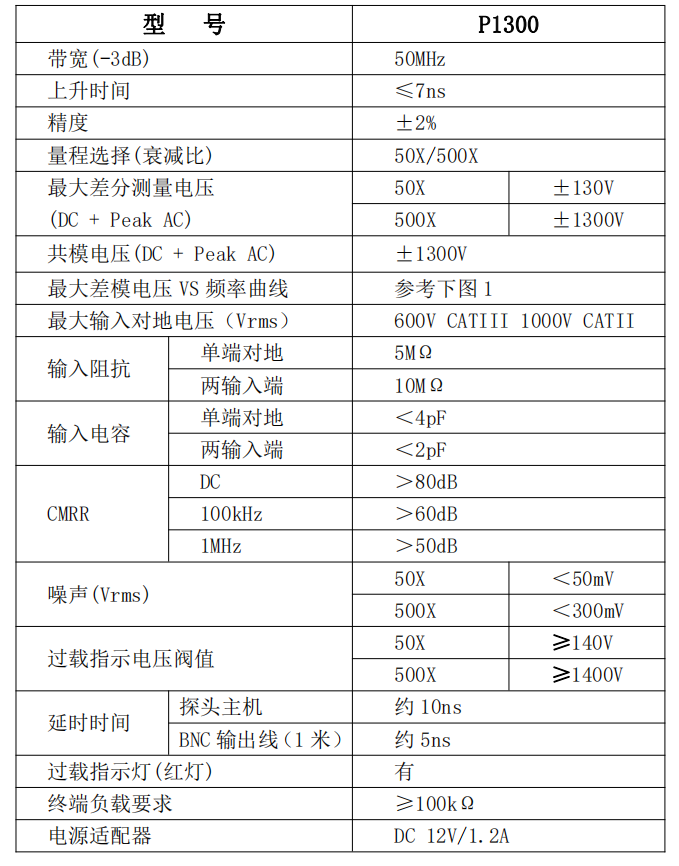 P1300 高壓差分探頭是具有浮地測量功能的高壓差分探頭。其帶寬達到 50MHz,滿足了大部分測試系統(tǒng)的需要;雙量程可供選擇,其差動測量電壓范圍滿足大部分測試電路的要求;具有過載報警功能;探頭配備標準的 BNC 輸出接口,可與任何廠家的示波器配合使用。探頭具備良好的共模噪聲抑制能力,輸入端具有較高的輸入阻抗和較低電容,可以準確高速地測量差分電壓信號??蓮V泛用于開關(guān)電源﹑變頻器﹑電子鎮(zhèn)流器﹑變頻家電和其它電氣功率裝置等的研發(fā)﹑調(diào)試或檢修工作中。