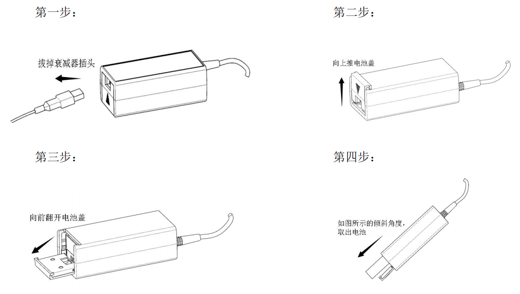 產(chǎn)品標配 7.4V/950mAh 兩塊鋰電池,如上圖所示:電池安裝位置,本設(shè)計在插入衰減器后,衰減器起到限位作用,電池無法取出,如需取出電池充電,參考如下步驟: