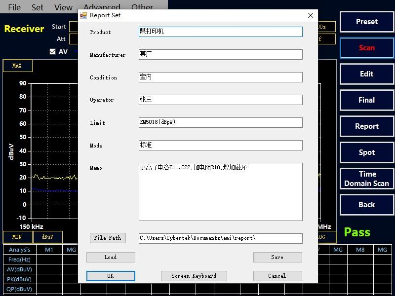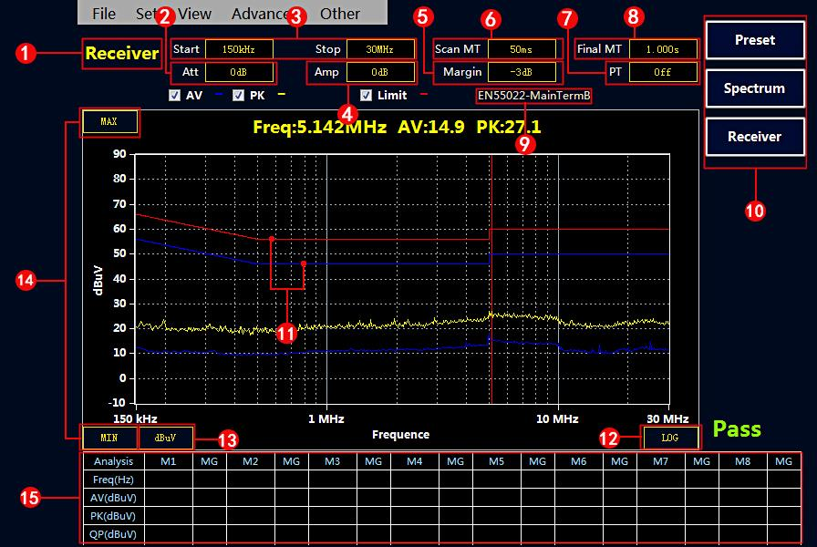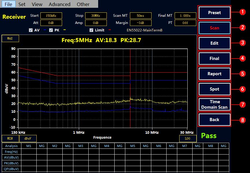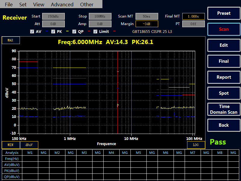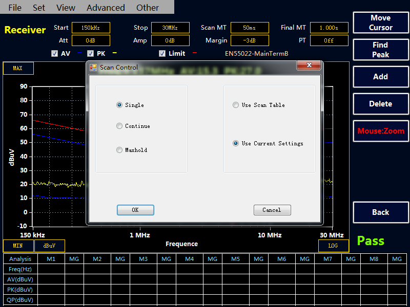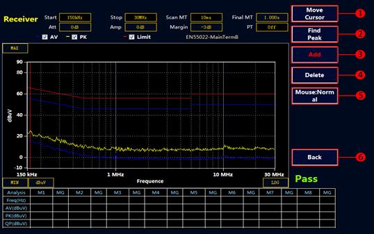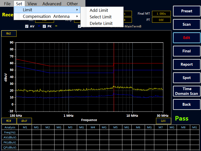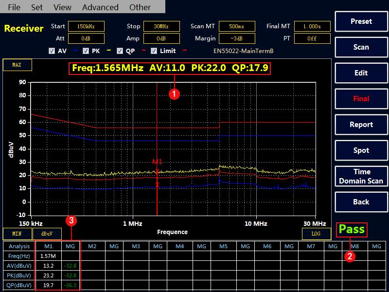 選擇“Final” 按鍵,接收機會對表格中的點進行終測,測量 PK,AV,QP 值,測量時間在Final MT 中設(shè)置。如果沒有超標點或者手動添加的測試點,F(xiàn)inal 終測是無效的。注意:終測時請不要關(guān)閉被測設(shè)備。