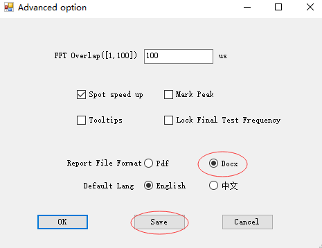 選擇“Make Report”,會自動生成 PDF 形式的報告??梢员4娴街鳈C或者通過 USB 接口存儲到 U 盤中。也可點擊接收機模式下的主菜單中的快捷鍵“Report”直接生成報告。另外也可以生成 word 版的報告(前提是主機需要安裝 WPS 或者word),點擊 Advanced——Advancedoption 中報告文件格式選擇 Docx,點擊 Save 后,下次開機啟動自動生成 word 版測試報告。