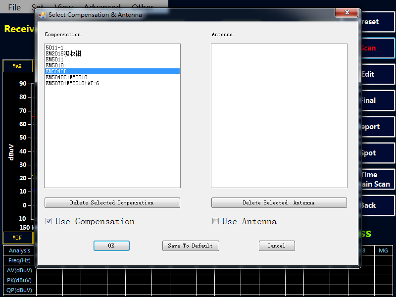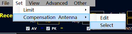 調(diào)用補償曲線時點擊“Set-Compensation Antenna-Select”,選擇所需的補償曲線。然后點選“Use Compensation”程序?qū)?yīng)用當前補償曲線,并在表格上顯示補償?shù)闹?。點擊 OK 確認。