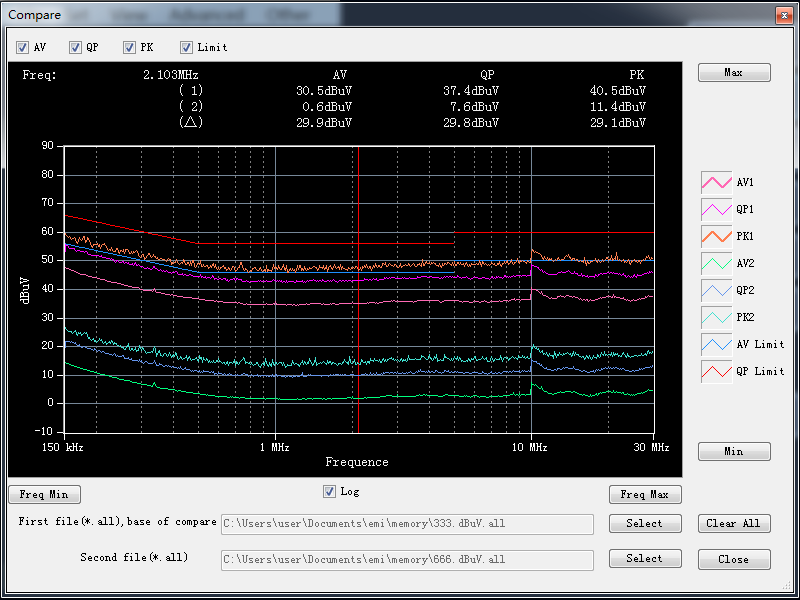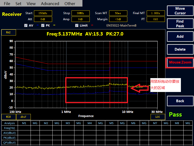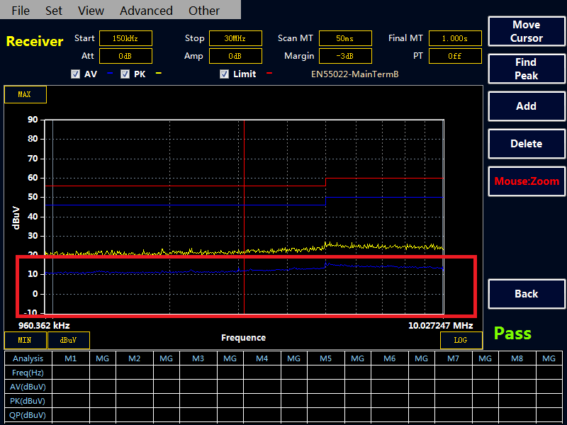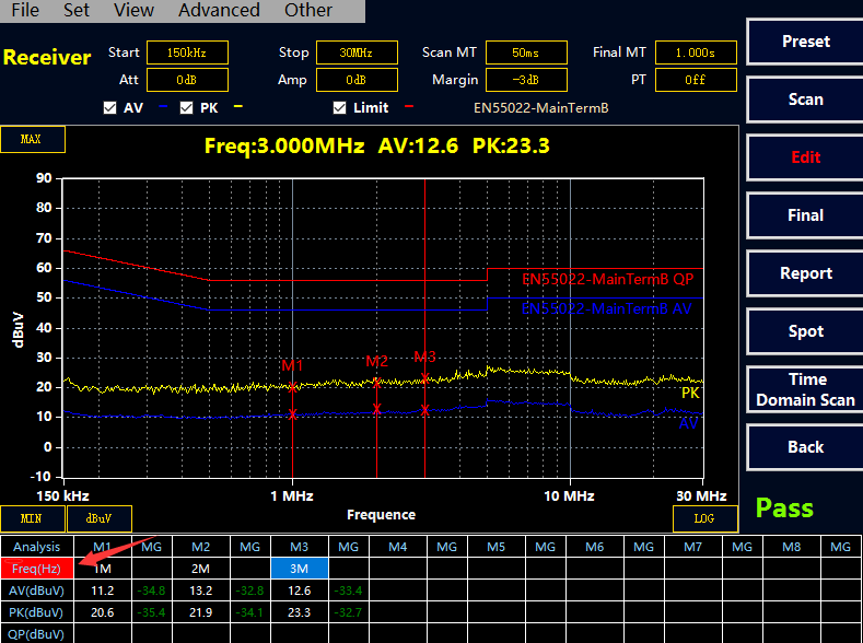 在菜單欄中點擊 Advanced——Advanced option,將 Lock Final Test Frequency 選項勾上,點擊OK,回到主界面的超標點的頻率那一欄顯示紅色,說明設(shè)置成功,然后添加自己需要的測試頻點。(在接收機掃描到 PK 值和 AV 值后,如果客戶需要一直關(guān)注的峰值點的頻率對應(yīng)的 PK,AV,QP 值,可以鎖定頻率點,在下次終測時,可以固定掃描自己需要的頻點。)