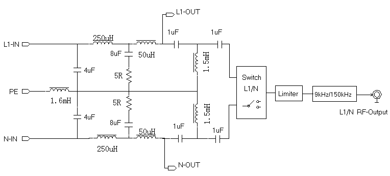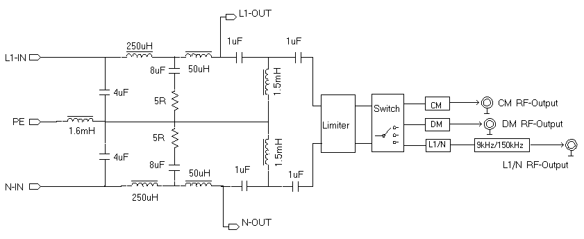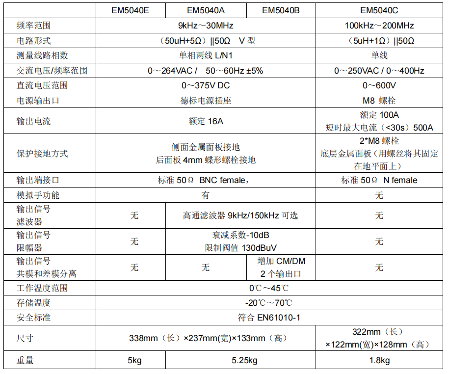 EM5040E/5040A/5040B 的 V 型人工電源網(wǎng)絡部分是完全相同的。所不同的是后續(xù)信號處理部分。EM5040E 只有基本的 V 型人工網(wǎng)絡部分。為了保護后級設備,推薦增加限幅器,可選用本公司EM5010A。