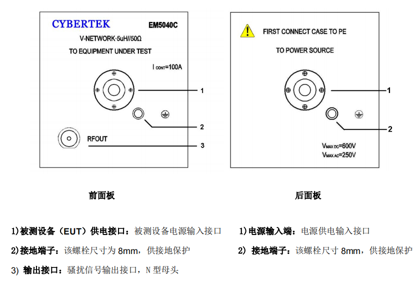 2(被測設備(EUT)供電接口):本儀器的電源接口為德標。同時產(chǎn)品的附件中為客戶標配了國標轉接頭。